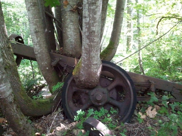 The wheels are from a cart left on a somewhat historic site, where there used to be a mill several decades ago, and the tree just grew through it.